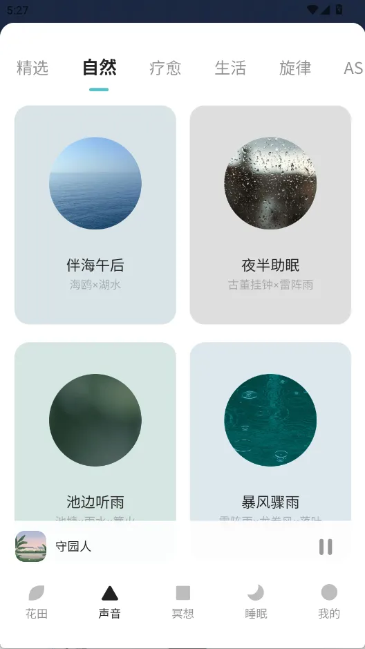 它这里面有雨声、鸟鸣、溪流、篝火这些自然声音,真实度相当高,不像某些App的声音是电脑合成的。