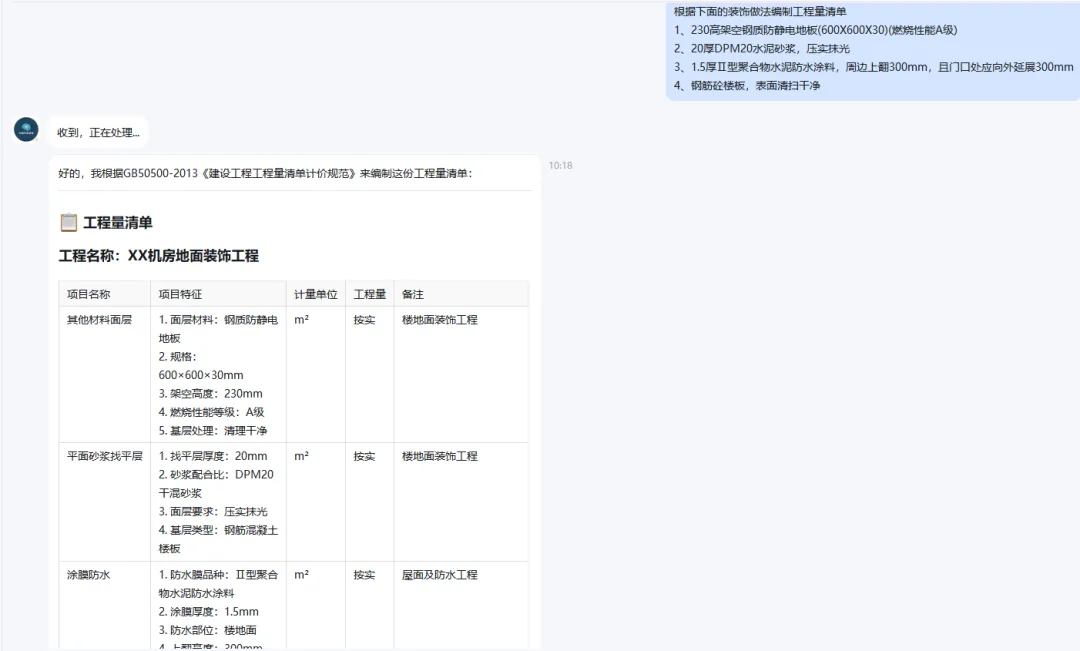 不用再翻厚重的清单规范,AI 张口就能答,省出大量翻书时间,还可以根据提供的装饰做法自动列清单。