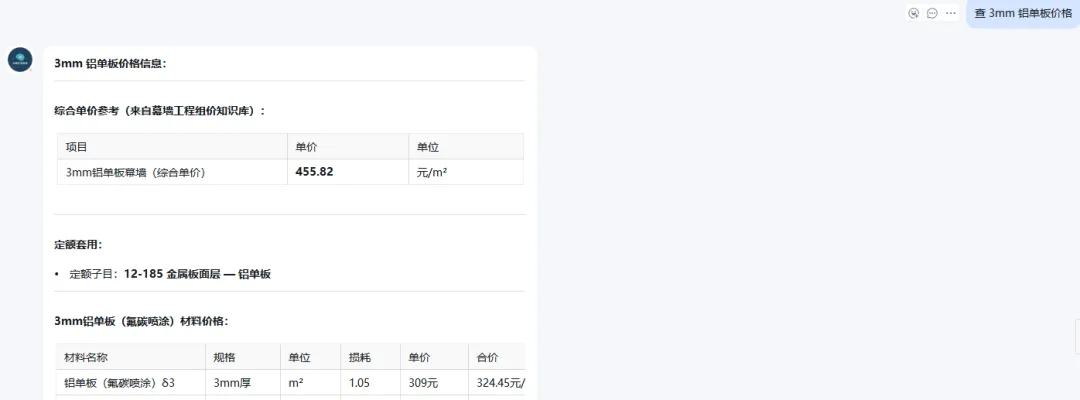 直接发材料名称:“查 3mm 铝单板价格”,AI 从知识库提取价格 + 参考来源(如造价信息网、厂商报价或之前的某某项目),不用再挨个平台翻。