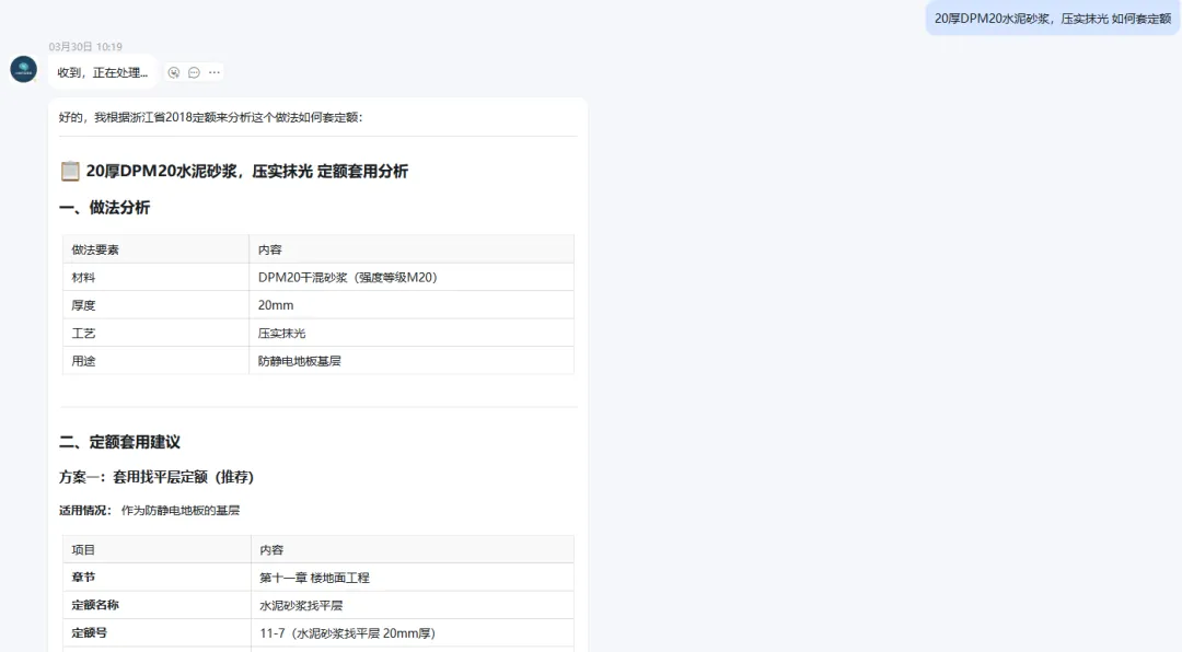 现在问 AI某个墙面装饰做法怎么套定额?”,它会直接告诉你:每道工序对应哪条定额、是否需要换算、人材机消耗量多少。