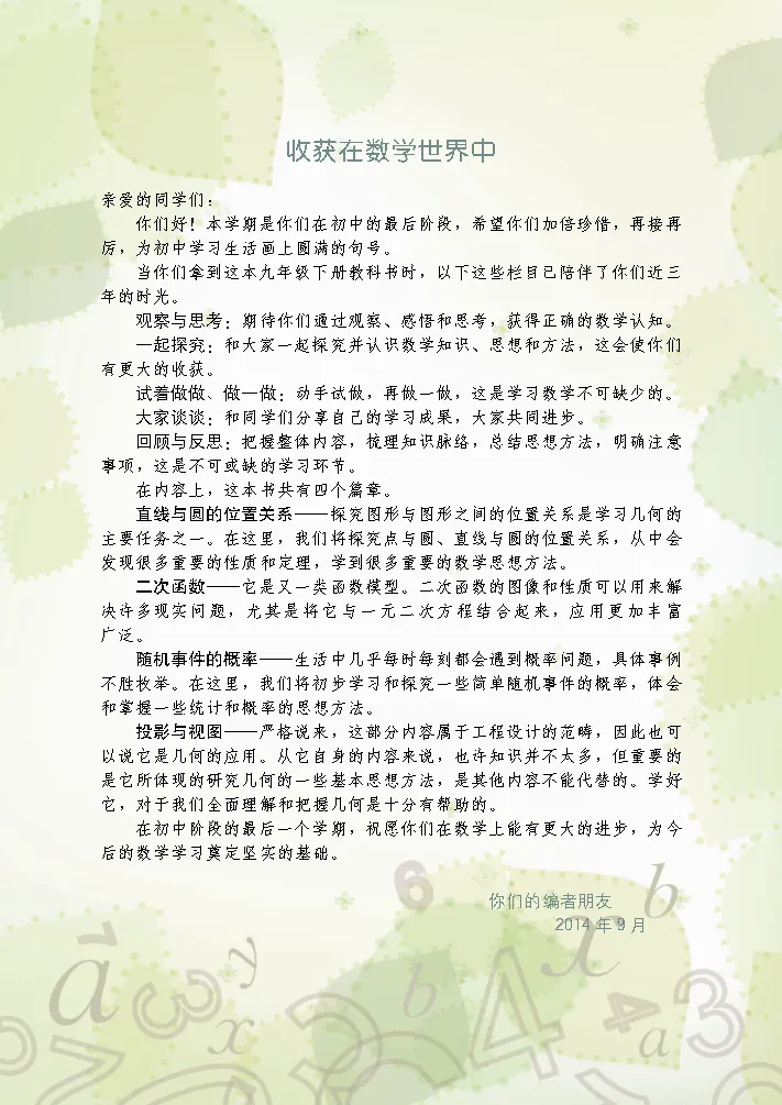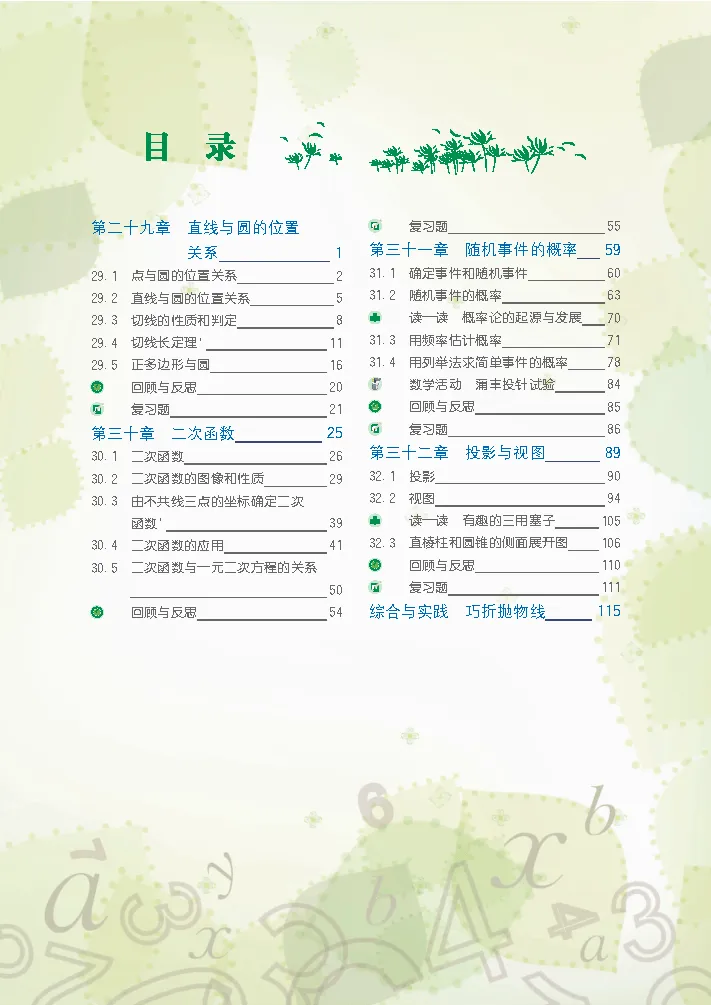 2026 春冀教版九年级下册数学高清电子版课本,以直线与圆、二次函数、随机事件的概率、投影与视图为核心,紧扣河北中考考纲,适配初三总复习与冲刺,可在线阅读、下载打印。