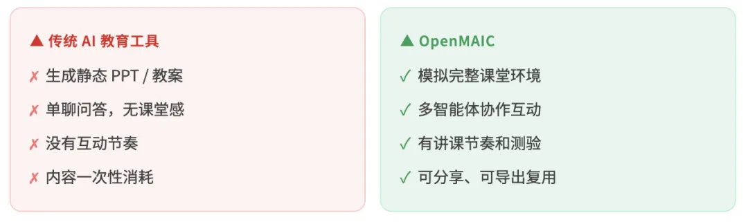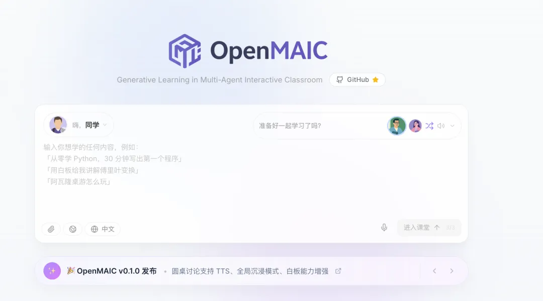 过去,AI 更多是辅助老师备课,帮写教案、生成 PPT;而 OpenMAIC 做的事是把 AI 变成课堂本身——它能模拟真实课堂的互动节奏,用多智能体的协作,让学习从”被动接收”变成”主动参与”。对老师是减负神器,对学生是随时可开启的个性化学伴。
