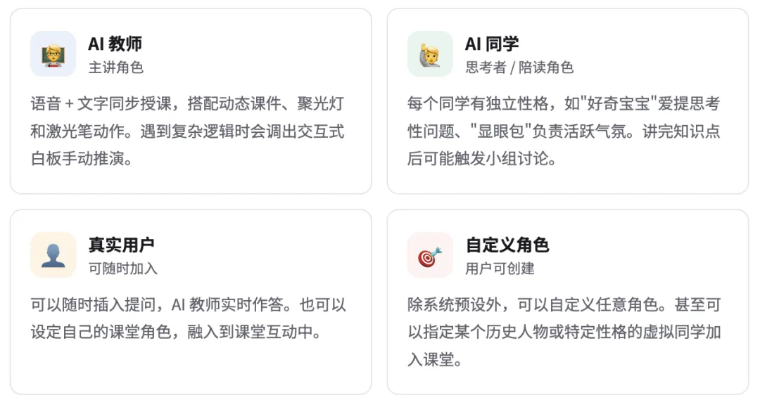 和现有 AI 教育工具最大的区别:以前用 AI 学习,基本是一来一回的单聊;OpenMAIC 里,AI 会同时扮演老师和多个同学,在讲课过程中触发讨论、提问、测验,整体更接近真实课堂的节奏。