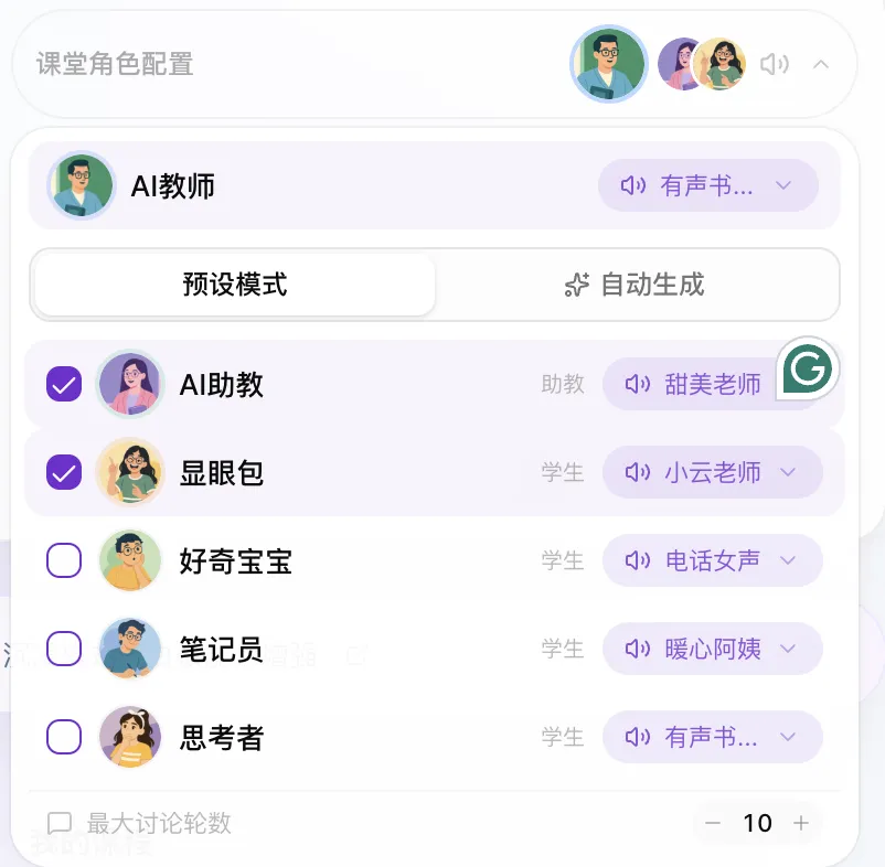 左侧设定你自己的”学生”性格人设,右侧配置出现在课堂里的 AI 同学角色。也可以开启 自动生成 让系统根据课程内容自动匹配合适角色。