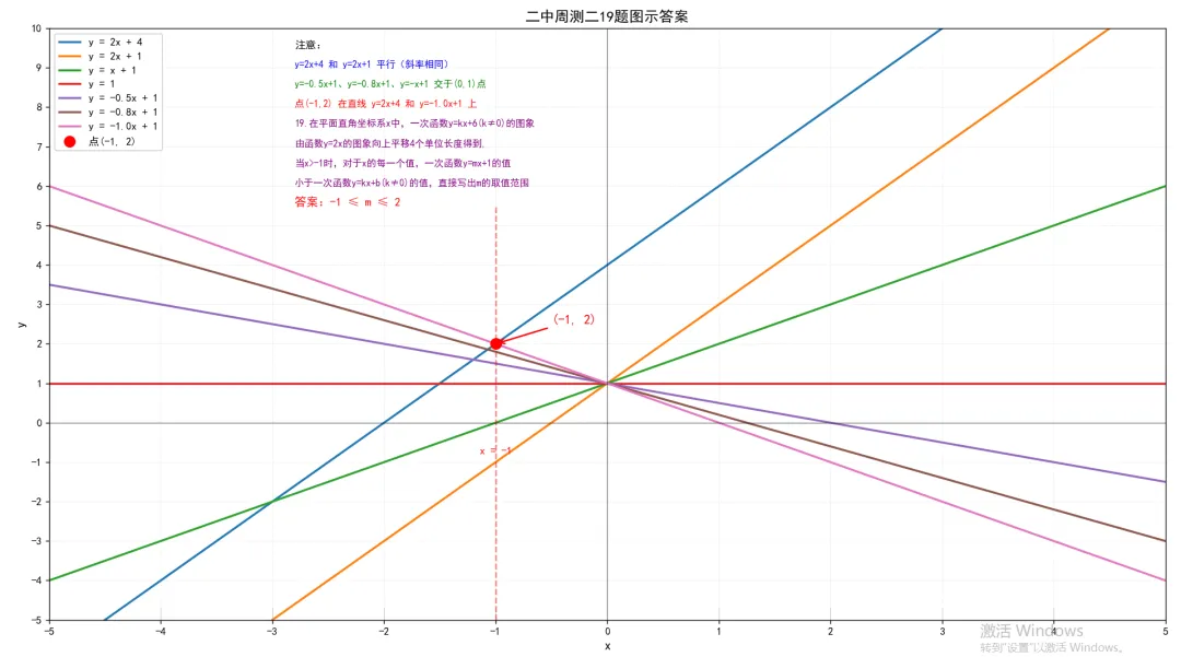 19.在平面直角坐标系x中,一次函数y=kx+6(k≠0)前图象由函数y=2x的图象向上平移4个单位长度得到,当x>-1时,对于x的每一个值,一次函数y=mx+1的值小于一次函数y=kx+b(k≠0)的值,直接写出m的取值范围。