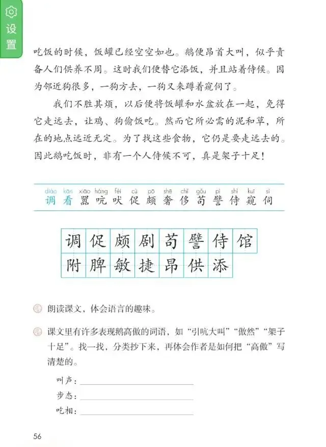 3. 吃相对比+细节描写:通过鹅“三眼一板、一丝不苟”的吃饭规矩(先吃冷饭,再喝水,再吃泥、草),与狗“躲在篱边窥伺、敏捷偷吃、扬长而去”的猥琐行为对比;再写鹅吃饭需人“侍候”、饭被偷吃后“昂首大叫”,精准刻画鹅吃相的刻板讲究、架子十足,全方位展现“高傲”。