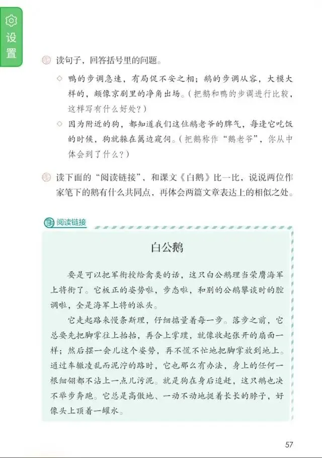 四、读“阅读链接”《白公鹅》……说说两位作家笔下的鹅有什么共同点,再体会两篇文章表达上的相似之处