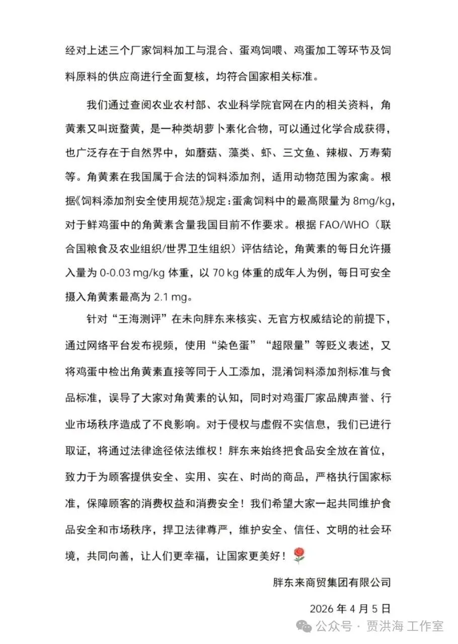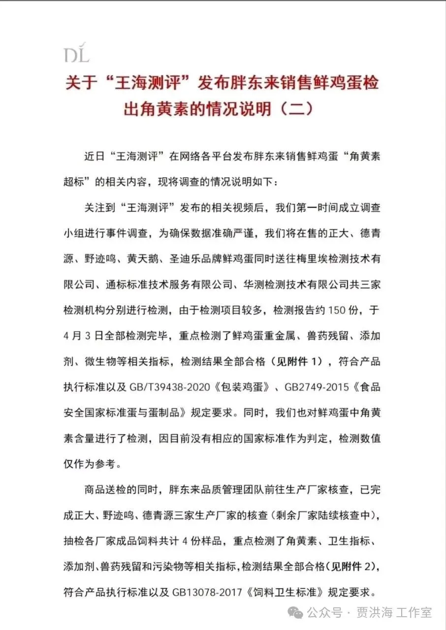 4月5日,胖东来商贸集团有限公司通过其抖音官方账号发布《关于“王海测评”发布胖东来销售鲜鸡蛋检出角黄素的详细情况说明》。