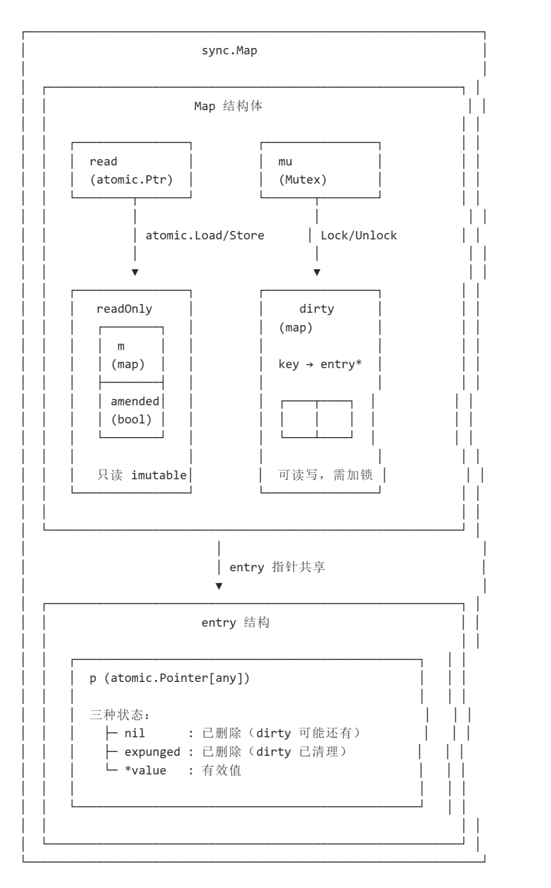 sync.Map 的核心设计是”双 map + entry 指针共享“: