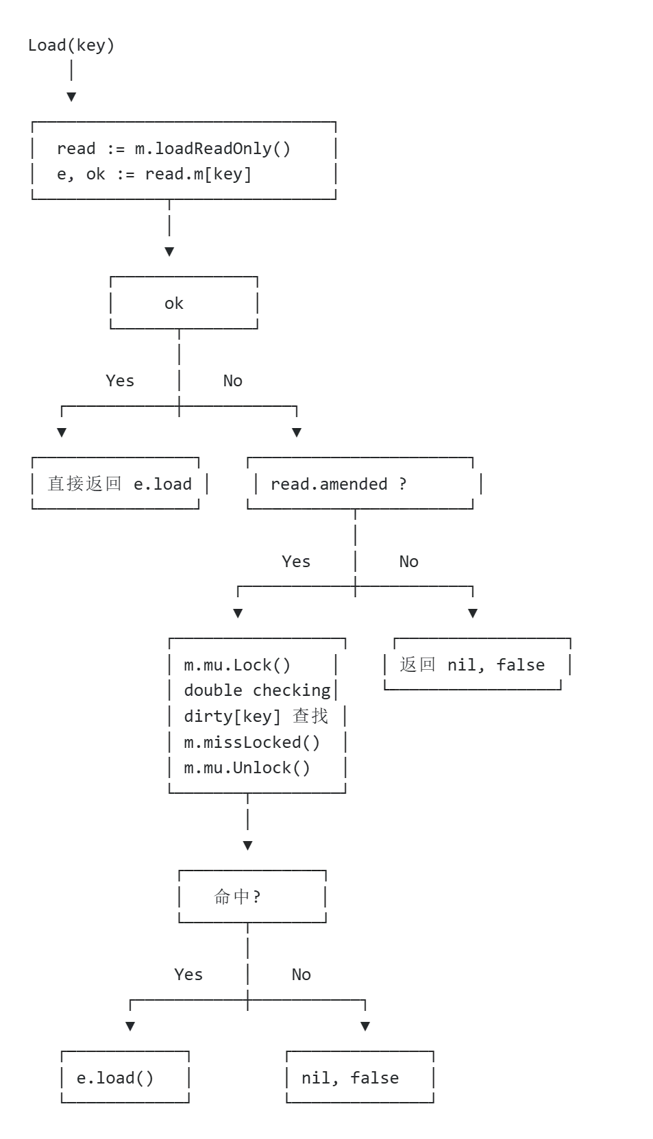 // Load 返回 map 中 key 对应的值// 如果没有值,返回 nil, false// 时间复杂度: amortized O(1)func(m *Map)Load(key any)(value any, ok bool) {// 步骤 1: 读取 read 快照(无锁 fast path) read := m.loadReadOnly() e, ok := read.m[key]// 步骤 2: 检查是否需要走 slow path// 条件:read 中没有命中 且 dirty 有额外 key(amended=true)if !ok && read.amended {// 步骤 3: 加锁,进入 slow path m.mu.Lock()// ---- double checking ----// 防止在等待锁期间,dirty 被升级到 read// 导致我们误判为未命中 read = m.loadReadOnly() e, ok = read.m[key]// 步骤 4: 再次检查 read,仍未命中且 dirty 有额外 keyif !ok && read.amended {// 从 dirty 中查找(这是唯一可能存在新 key 的地方) e, ok = m.dirty[key]// ---- 关键: 记录 miss,触发 dirty 升级 ----// 当 misses 累积到一定程度,dirty 会被升级为新的 read m.missLocked() } m.mu.Unlock() }// 步骤 5: 返回结果if !ok {returnnil, false// key 不存在 }return e.load() // 从 entry 中加载值}