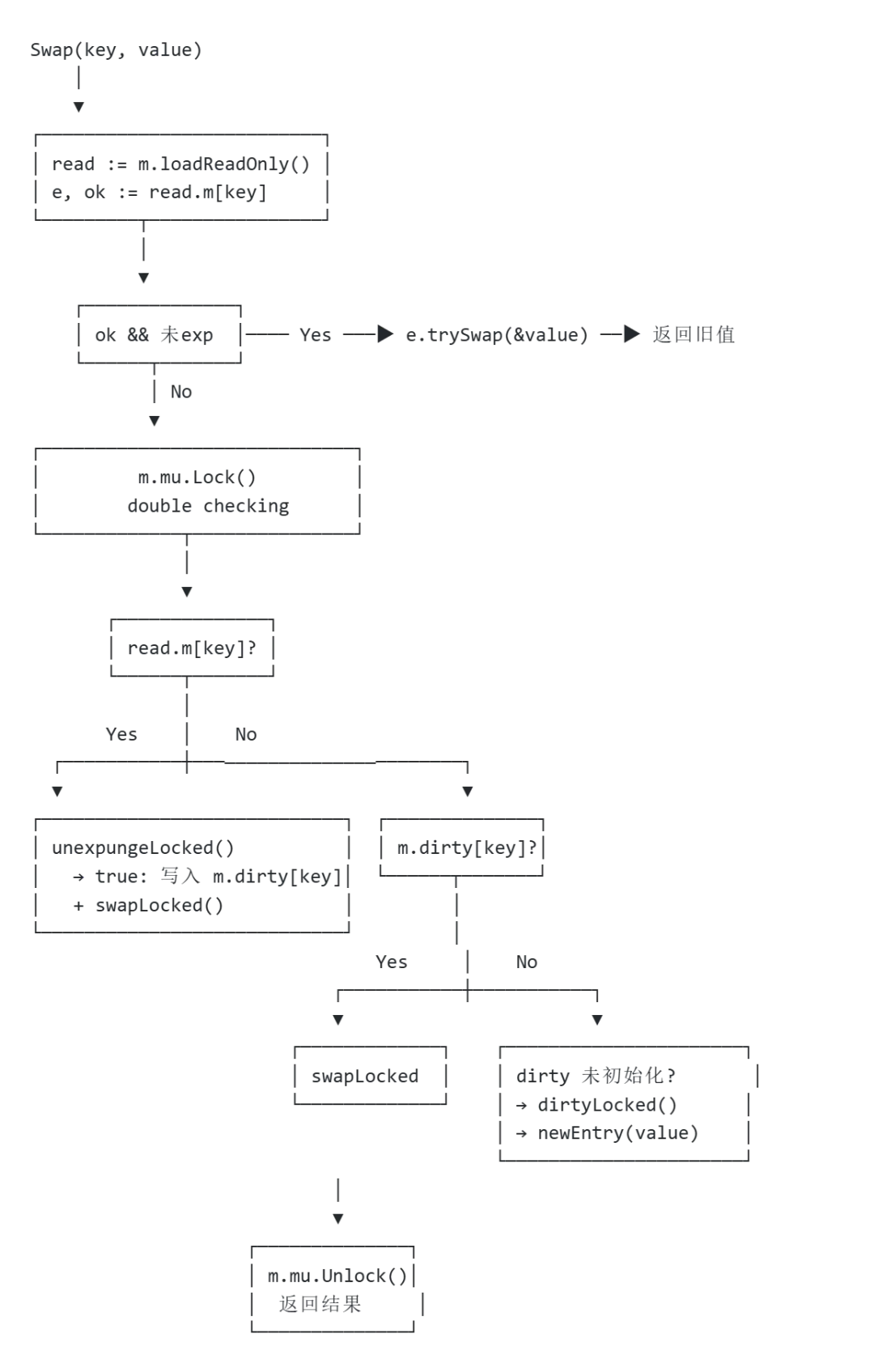 // Swap 原子地交换 key 的值,并返回旧值// 如果 key 不存在,loaded 返回 falsefunc(m *Map)Swap(key, value any)(previous any, loaded bool) {// 步骤 1: 读取 read 快照 read := m.loadReadOnly()// 步骤 2: 快速路径 - key 存在于 read 中// trySwap 尝试原子替换,如果 entry 未被 expunged 则成功if e, ok := read.m[key]; ok {if v, ok := e.trySwap(&value); ok {// 交换成功if v == nil {returnnil, false// 旧值为 nil(被删除过) }return *v, true// 返回旧值 }// trySwap 失败(entry 被 expunged),进入 slow path }// 步骤 3: 慢速路径 - 加锁处理 m.mu.Lock()// 再次读取 read(防止等待期间 dirty 升级) read = m.loadReadOnly()if e, ok := read.m[key]; ok {// 情况 A: key 存在于 read 中// 检查是否需要从 expunged 状态恢复// unexpungeLocked 尝试将 expunged 替换为 nil// 返回 true 表示之前确实是 expunged 状态if e.unexpungeLocked() {// 现在 entry 恢复正常,需要添加到 dirty 中// 否则后续从 dirty 找不到这个 key m.dirty[key] = e }// 原子交换值if v := e.swapLocked(&value); v != nil { loaded = true previous = *v } } elseif e, ok := m.dirty[key]; ok {// 情况 B: key 不在 read 中,但在 dirty 中if v := e.swapLocked(&value); v != nil { loaded = true previous = *v } } else {// 情况 C: key 是新插入的// 如果这是第一个新 key,需要初始化 dirty// 因为 read 中没有这个 key,dirty 可能有额外的 keyif !read.amended {// 创建 dirty 并将 read 中的非删除 entry 复制过去 m.dirtyLocked()// 标记 read 为"不完整"(dirty 有额外 key) m.read.Store(&readOnly{m: read.m, amended: true}) }// 插入新 entry m.dirty[key] = newEntry(value) } m.mu.Unlock()return previous, loaded}