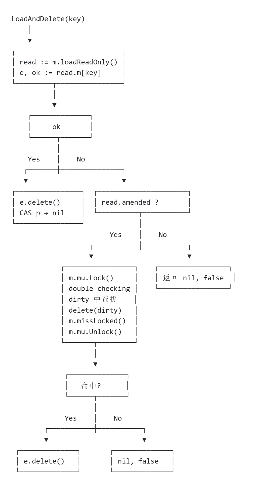 // LoadAndDelete 关键代码 (line 300-321)func(m *Map)LoadAndDelete(key any)(value any, loaded bool) { read := m.loadReadOnly() e, ok := read.m[key]// read 中找到,且 dirty 可能为 nil 或与 read 一致if ok {return e.delete() // 直接 CAS 删除,无需加锁! }// ...}// entry.delete - 无锁操作func(e *entry)delete()(value any, ok bool) {for { p := e.p.Load()if p == nil || p == expunged {returnnil, false// 已删除或已清理 }// CAS 将 p 从指向 value 改为 nilif e.p.CompareAndSwap(p, nil) {return *p, true// 逻辑删除成功 } }}