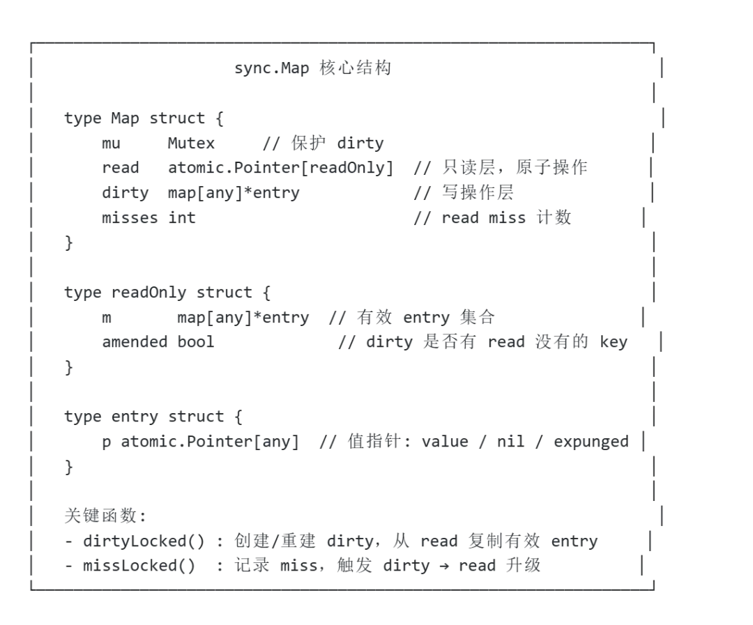 sync.Map 的核心设计是 **read(无锁读)、dirty**(写操作)和 misses(升级触发器)三者协作实现的自动流转机制。