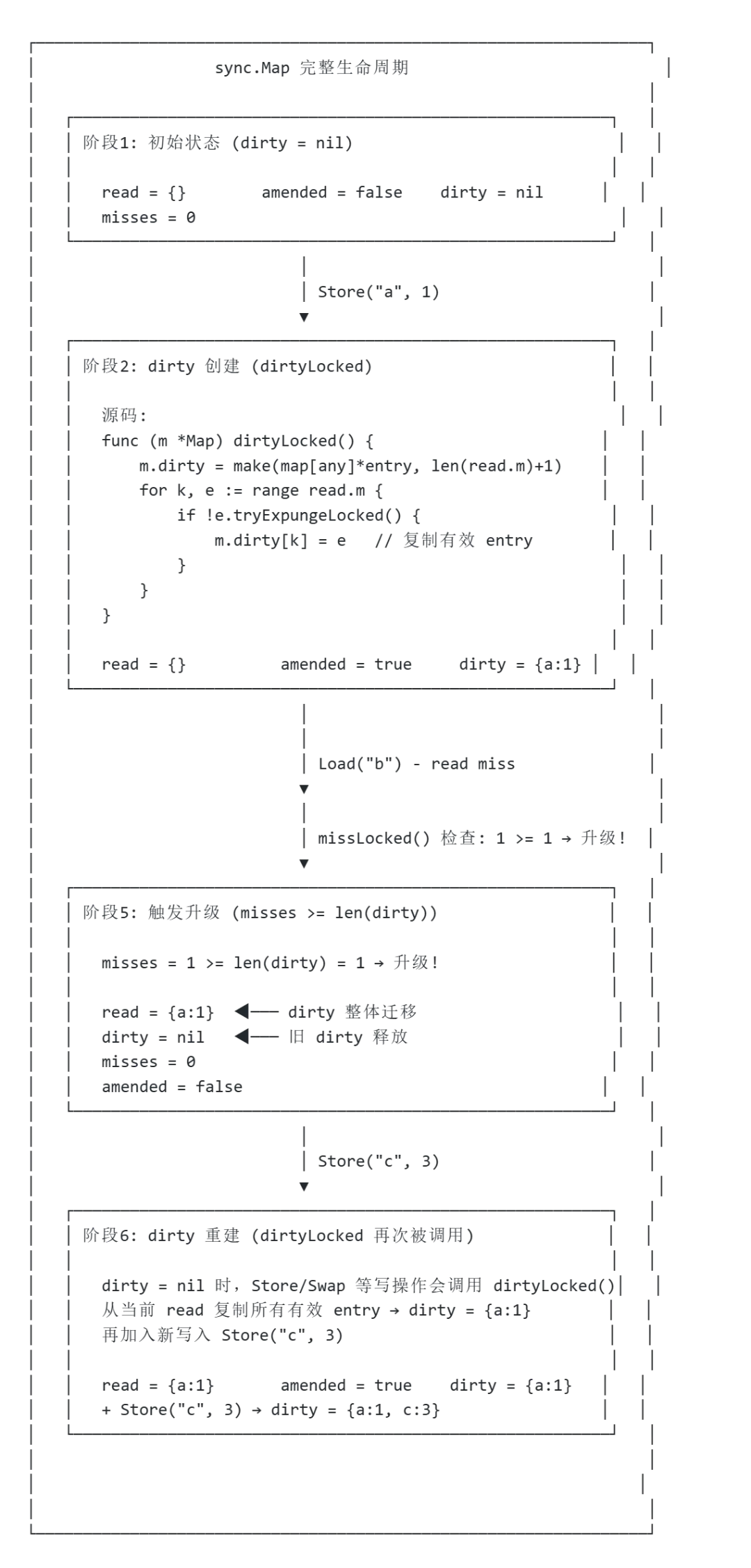 dirtyLocked() 在首次写入新 key 时被调用。它创建 dirty map 并从 read 复制有效 entry。关键点: