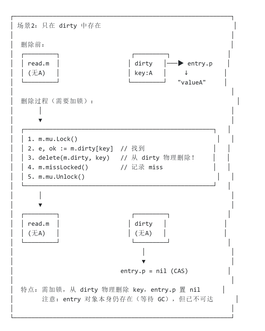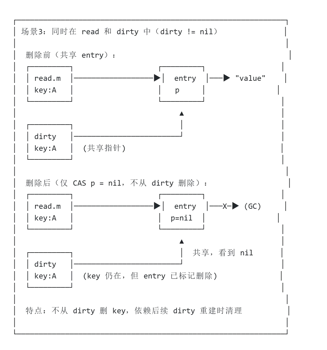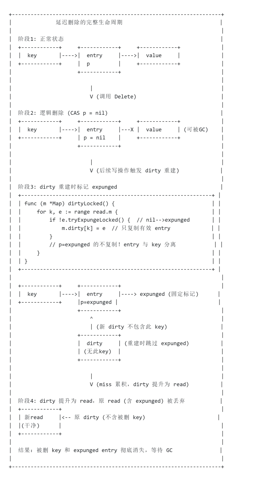 Delete(key) │ ▼┌─────────────────────────────────┐│ entry.p = nil(标记已删除) │└─────────┬───────────────────────┘ │ ▼ dirty 重建时┌─────────────────────────────────────────────┐│ 遍历 read,发现 entry.p = nil ││ 不拷贝到 dirty ││ 将 entry.p 从 nil 改为 expunged ││ 这是关键一步! │└─────────┬───────────────────────────────────┘ │ ▼ 后续 Store(key, valueB)┌─────────────────────────────────────────────┐│ read 中找到 entry,p = expunged ││ 知道 dirty 中没有这个 key ││ 先将 key→entry 加入 dirty ││ 再 CAS 更新 entry.p = valueB ││ ✓ 保证 dirty 重建时不会丢失这个 key │└─────────────────────────────────────────────┘