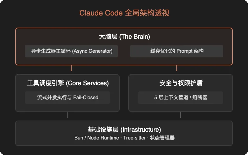 关键洞察:Claude Code 并非简单封装大模型 API,而是一个端到端的完整 Agent 运行时系统。大模型只是”大脑”,下面两层的工程化基础设施才是让它能真正干活的关键。