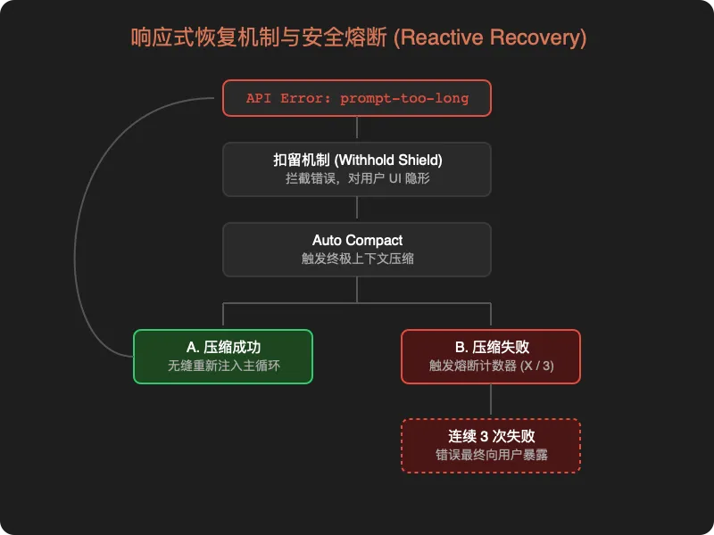 当 API 返回 prompt-too-long 错误时,普通系统的处理方式是直接抛给用户。Claude Code 的处理链路完全不同: