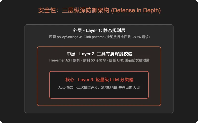 核心工程哲学:通过静态规则过滤 80% 的请求,让 LLM 分类器只处理模棱两可的边界情况。这样既保证了安全性,又最大化了流畅度——不会动不动就弹出”你确定吗?”的确认弹窗。