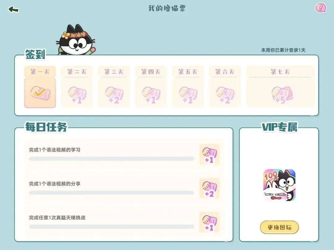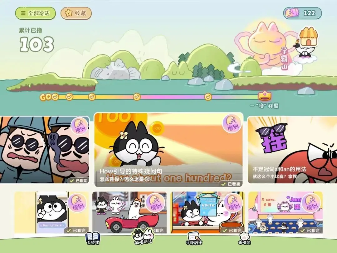 小孩子去年开始用的,里面的一个版块是“俩喵语法”课程,看一集需要一张撸猫票,撸猫票可以通过签到和完成任务获得,相当于是免费使用了,我家现在是已经解锁了所有课程,还积攒了一百多撸猫票。