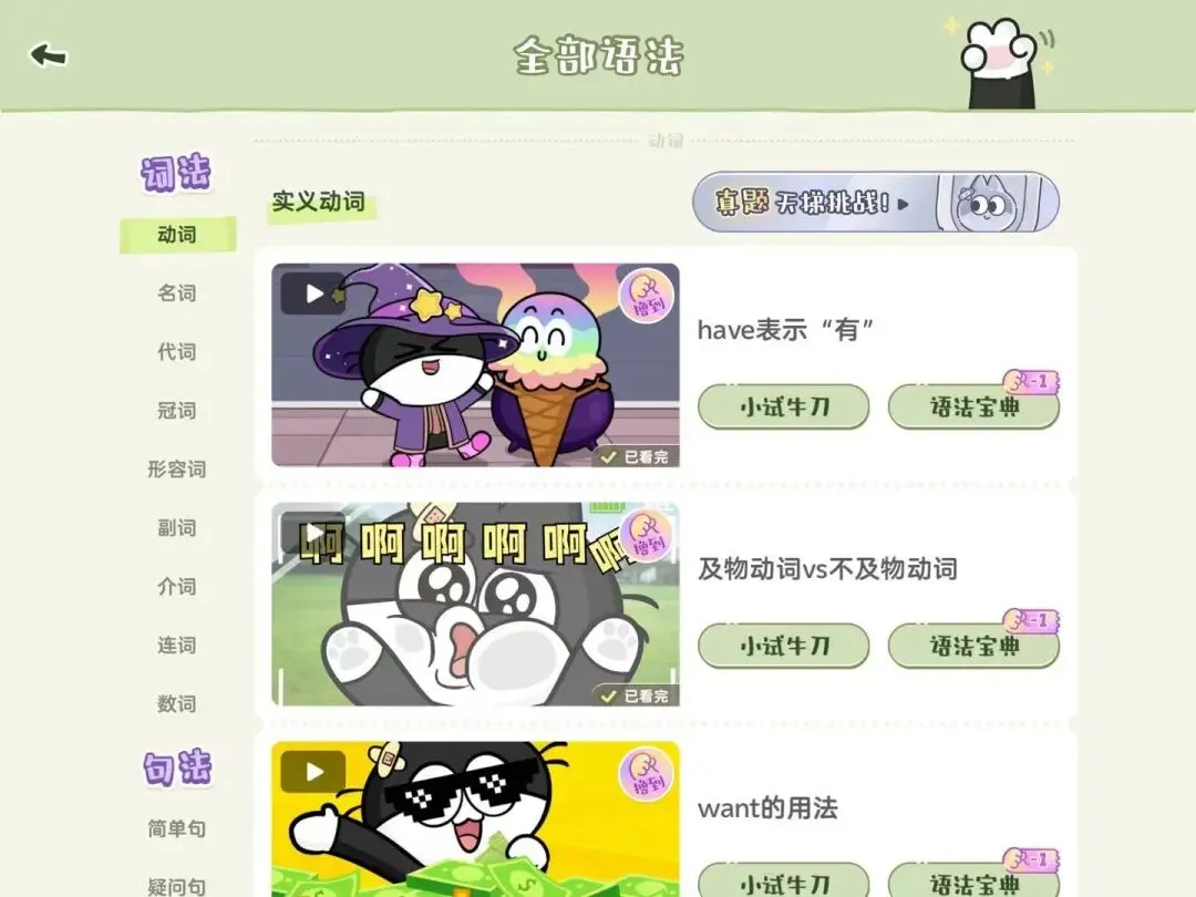 每一集语法都配有小试牛刀(练习题)和语法宝典(语法总结,需要撸猫票)。