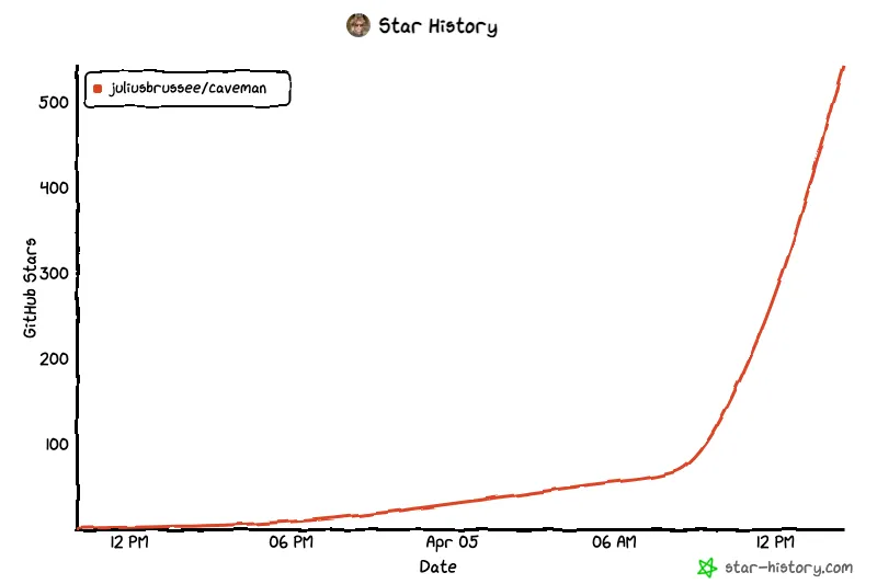 从这条GitHub star增长曲线来看,「JuliusBrussee/caveman」在最初很长一段时间里几乎只是缓慢爬升,随后陡然上扬: