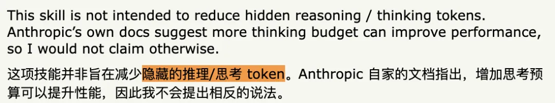 更关键的一点:作者Julius Brussee本人在HN讨论帖里主动澄清了,这个skill不针对hidden reasoning tokens和thinking tokens。