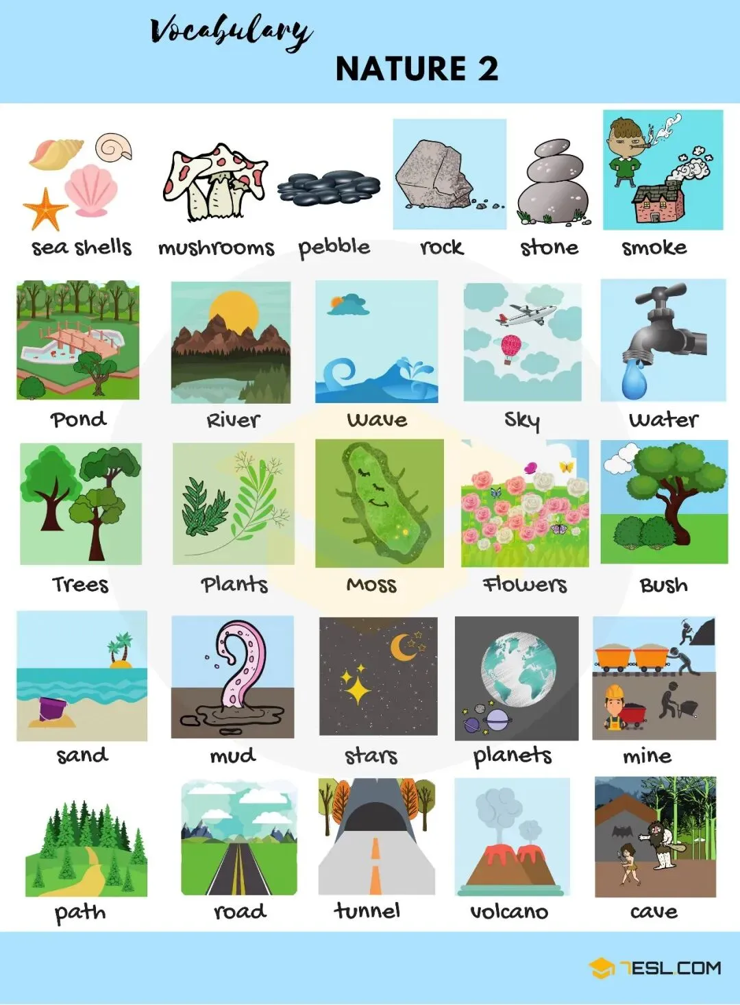 探索与风景、天气和气候相关的词汇,包括山脉、河流、森林以及春季、夏季、秋季和冬季等不同季节。