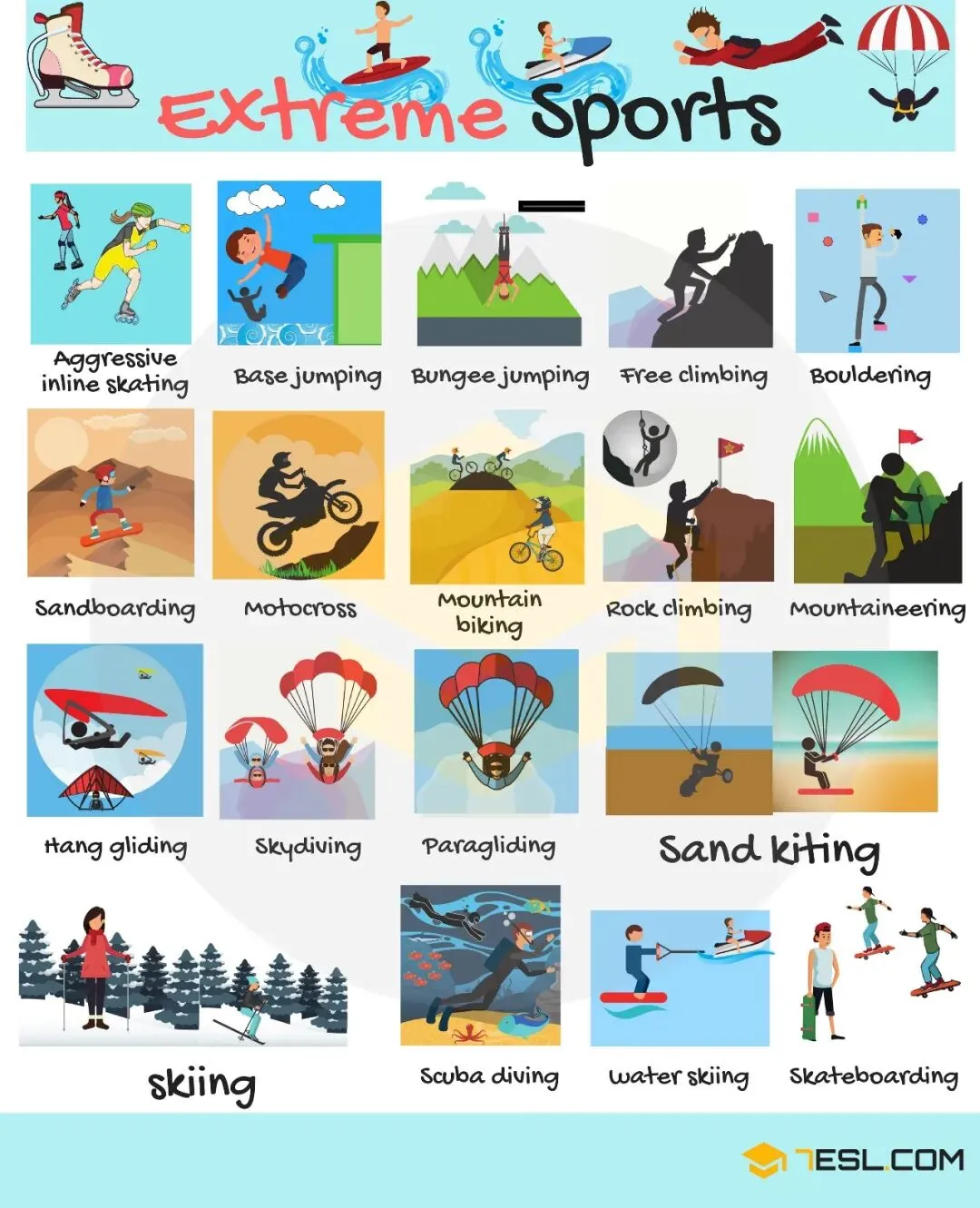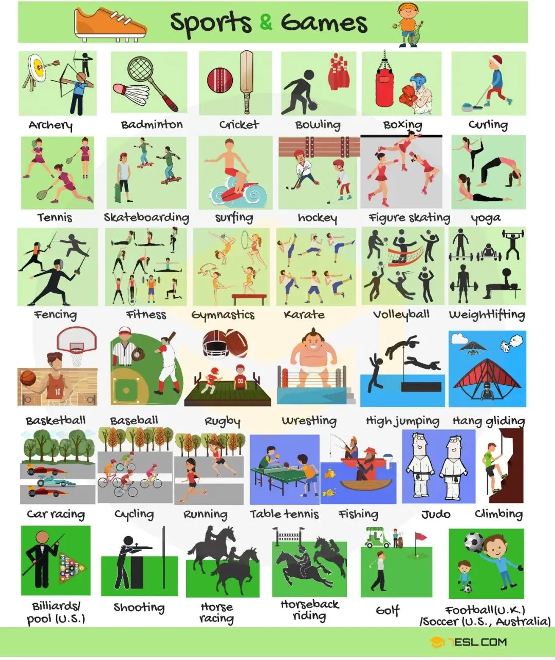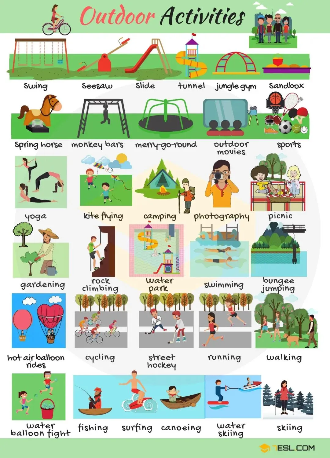 了解各种运动、锻炼和户外活动的名称,例如徒步旅行、游泳和骑自行车。