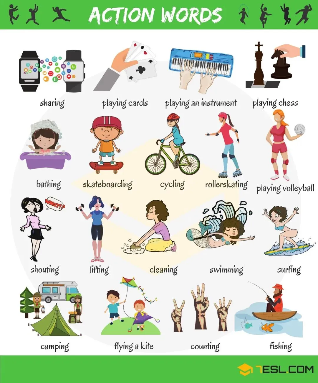 学习一些常用的动作词汇,这些词汇对于沟通至关重要,包括动作、沟通和日常活动。