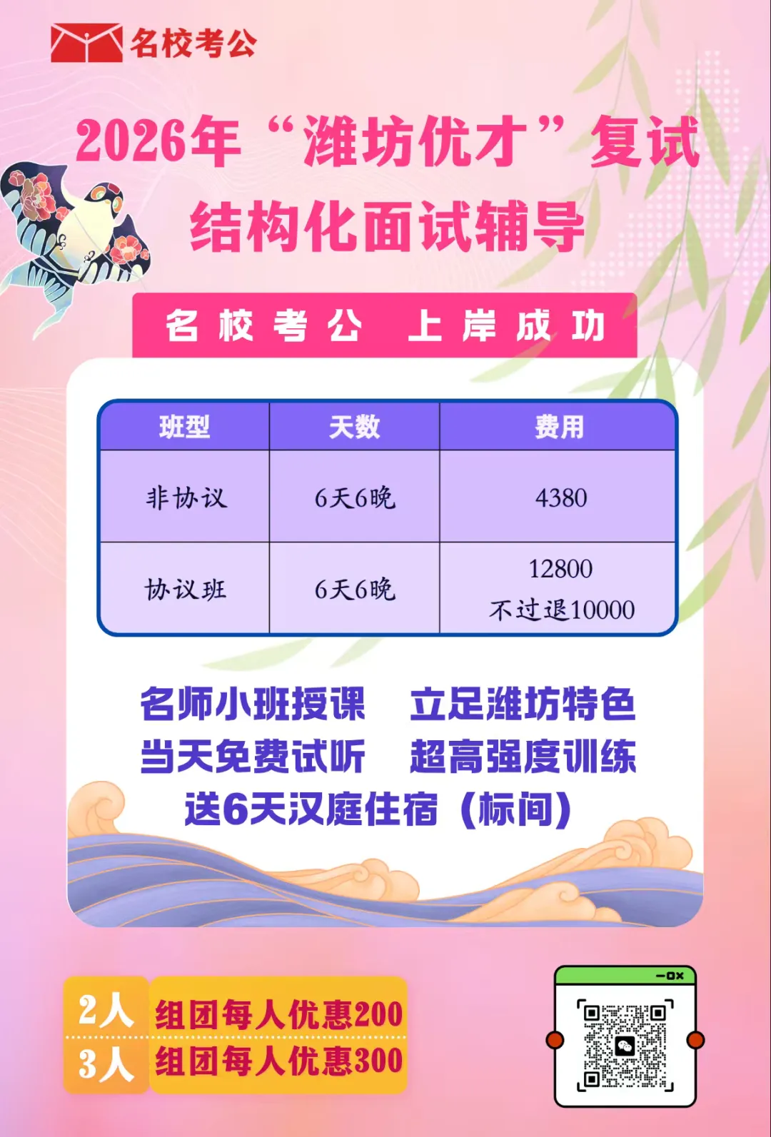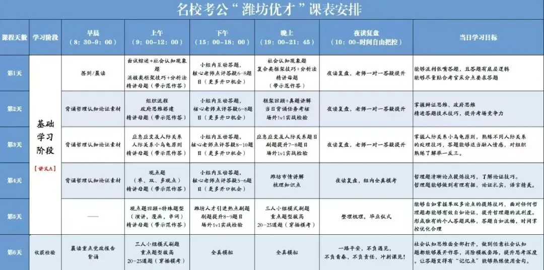 所有系统班次学生,均享受内部价(1500含住宿)获得潍坊优才考前3天强化冲刺课。(假设4.6考试,冲刺时间定为4.2-4.4三天,找回答题状态)