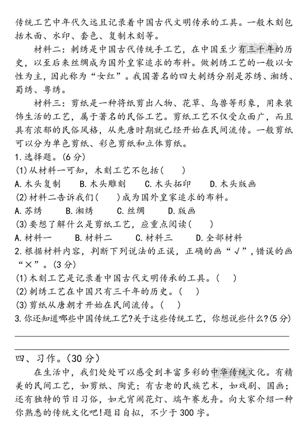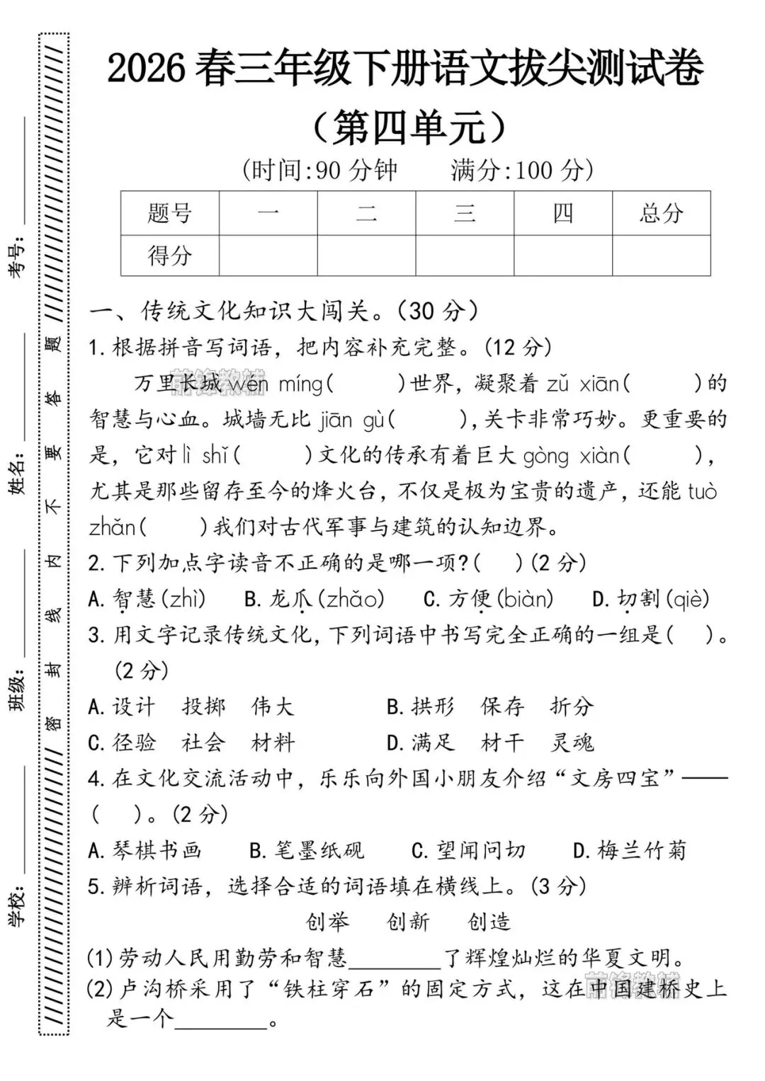 三年级下册语文第四单元测试卷《电子版附答案》