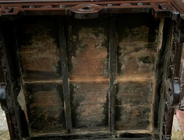 图里放大的紫檀木头纹路,花点点的,质地油亮,用刀刻过的地方摸得出凹槽,早先老算盘、老柜都舍得用真材实料,本来是小门小户攒的成色,现在一截旧料子都能收到贵价,不拼手艺就拼材质,留着真别嫌脏。
