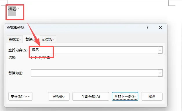 在第一个【查找内容】的框里,输入你写错的字/词,比如你把 “报名” 写成了 “抱名”,就在这里输入 “抱名”。