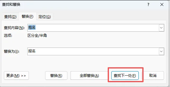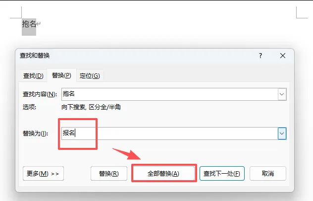 在第二个【替换为】的框里,输入正确的字/词,比如这里就输入 “报名”。