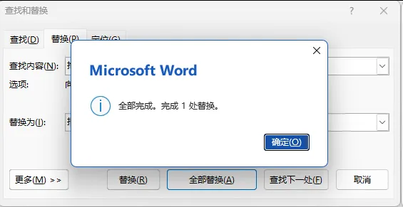 改完后会弹出一个小提示,告诉你一共改了多少处,点击【确定】,再关闭「查找和替换」窗口就完成了。