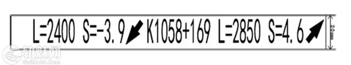 防护墙、隧道壁、道床板侧面上按照(通线〔2016〕8424-18)刷写,白底黑字,使用反光油漆刷写。刷写在轨腰上的坡度标识,在实际位置两侧分别依次刷写“坡长+坡度+坡向指示箭头+里程+坡长+坡度+坡向指示箭头”,白底黑字,反光油漆刷写,仿宋字体,字高60mm×宽30mm。如下图所示:󠄐󠄹󠅀󠄪󠄡󠄨󠄠󠄞󠄡󠄧󠄢󠄞󠄢󠄠󠄞󠄦󠄡󠄬󠅒󠅢󠄟󠄮󠄐󠅅󠄹󠄴󠄪󠄡󠄬󠅒󠅢󠄟󠄮󠄾󠅑󠅝󠅕󠄪󠄡󠄣󠄢󠄧󠄩󠄡󠄩󠄧󠄩󠄧󠄩󠄬󠅒󠅢󠄟󠄮󠇘󠆭󠆘󠇙󠆝󠅵󠇗󠆭󠆁󠄐󠇗󠅹󠅸󠇖󠆍󠅳󠇖󠅹󠅰󠇖󠆌󠅹󠄬󠅒󠅢󠄟󠄮