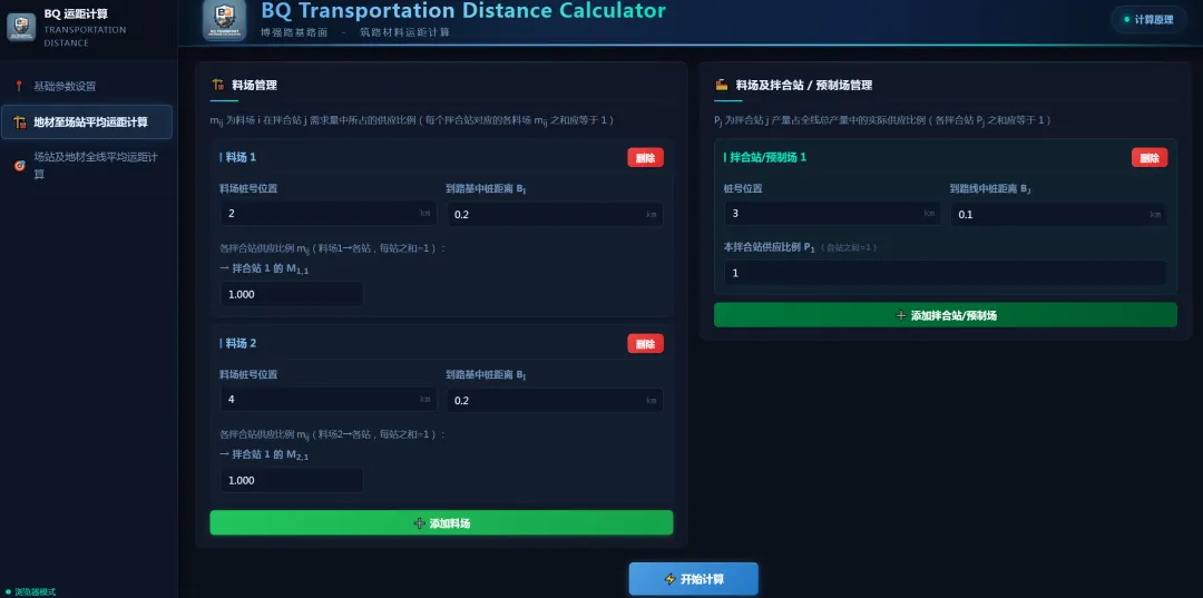 首先是地材至场站的计算,比如3个上面层碎石料场到5个沥青拌合站,计算其平均运距。地材至场站平均运距计算需要两步实现,第一步是计算同一种地材各料场运送至各拌合站的平均运距,这里需要明确各料场在各拌合站的供应比例m。第二步是根据各拌合站在全线的供应比例P来计算最终的地材运送至拌合站的全线平均运距,这里我直接用我自制计算程序中的计算原理来解释。