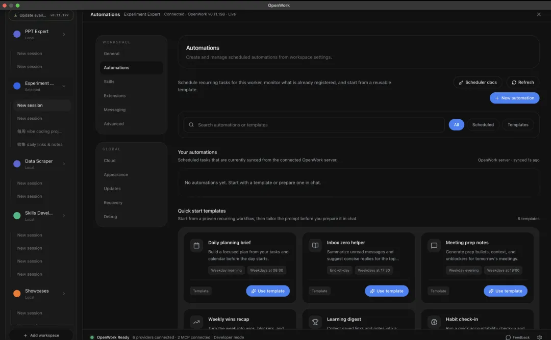 OpenWork 是对应Claude CoWork的开源方案,核心设计思路是:把产品经理的日常工作流配置成可重复运行的 Agent,下次触发不用再从头配。