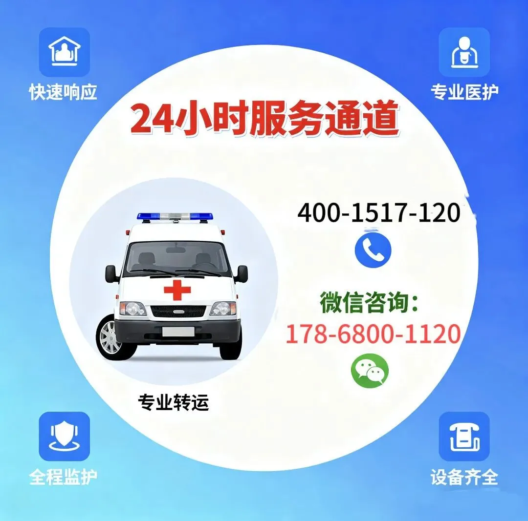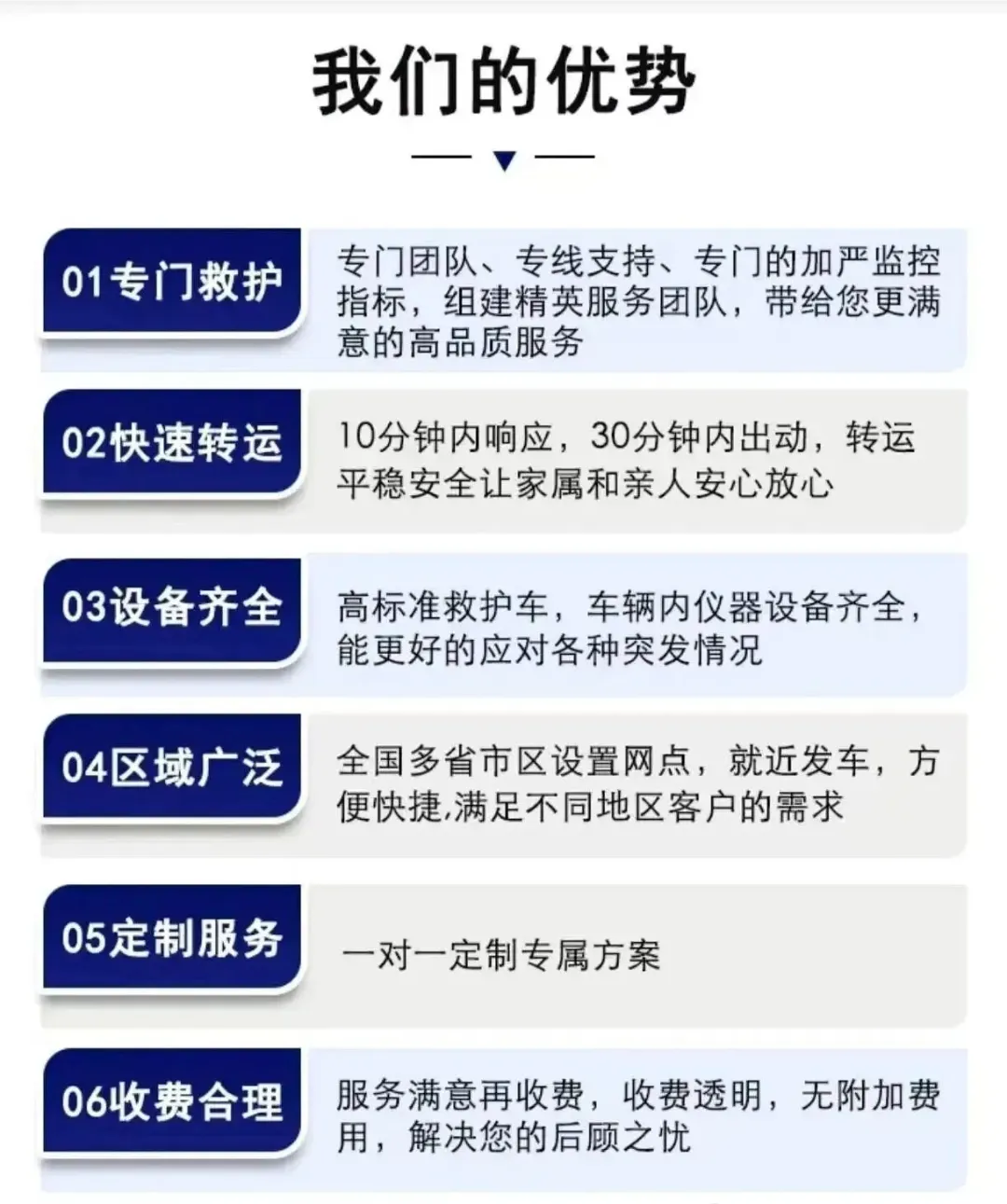 “我们是救护车出租转运公司,120救护车接送病人预约护送。24小时为术后康复、危重患者及跨区域就医人群提供专业医疗转运服务,提供120救护车出租‖救护车转运‖120救护车(非急救)‖跨省长途转运‖危重病人转运‖市内转运‖术后康复病人转运‖高铁病人转运‖患者返乡‖大型活动赛事保障‖配备ICU设备:呼吸机 · 心电监护仪 · 吸痰器 · 微量泵 · 氧气 · 急救药箱 · 专业医护团