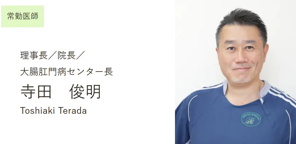 寺田病院は、専門的領域である『大腸肛門科』『内視鏡検査』『スポーツ整形外科』を柱とし、今まで近隣の先生方との連携で大事にしてきた内科的地域医療と、腹部の痛みで来院した患者様の診断を当院で完結できるように、胃腸内科だけでなく泌尿器科と婦人科も併設しております。当院は、痔、ソケイヘルニア(脱腸)などの短期入院手術専門施設です。なかには遠方からご来院になる患者様もいらっしゃいます。今後も医療スタッフの育成と充実をはかり、患者様一人ひとりの健康を支えていく病院サービスを常に目指して参りたいと考えております。