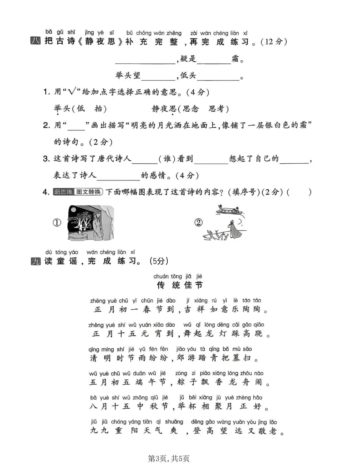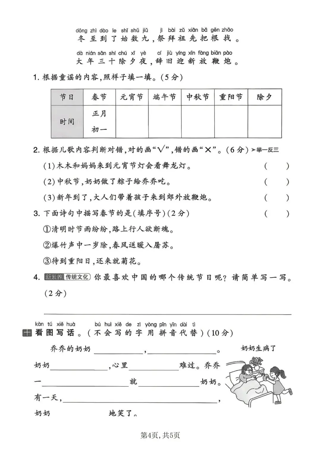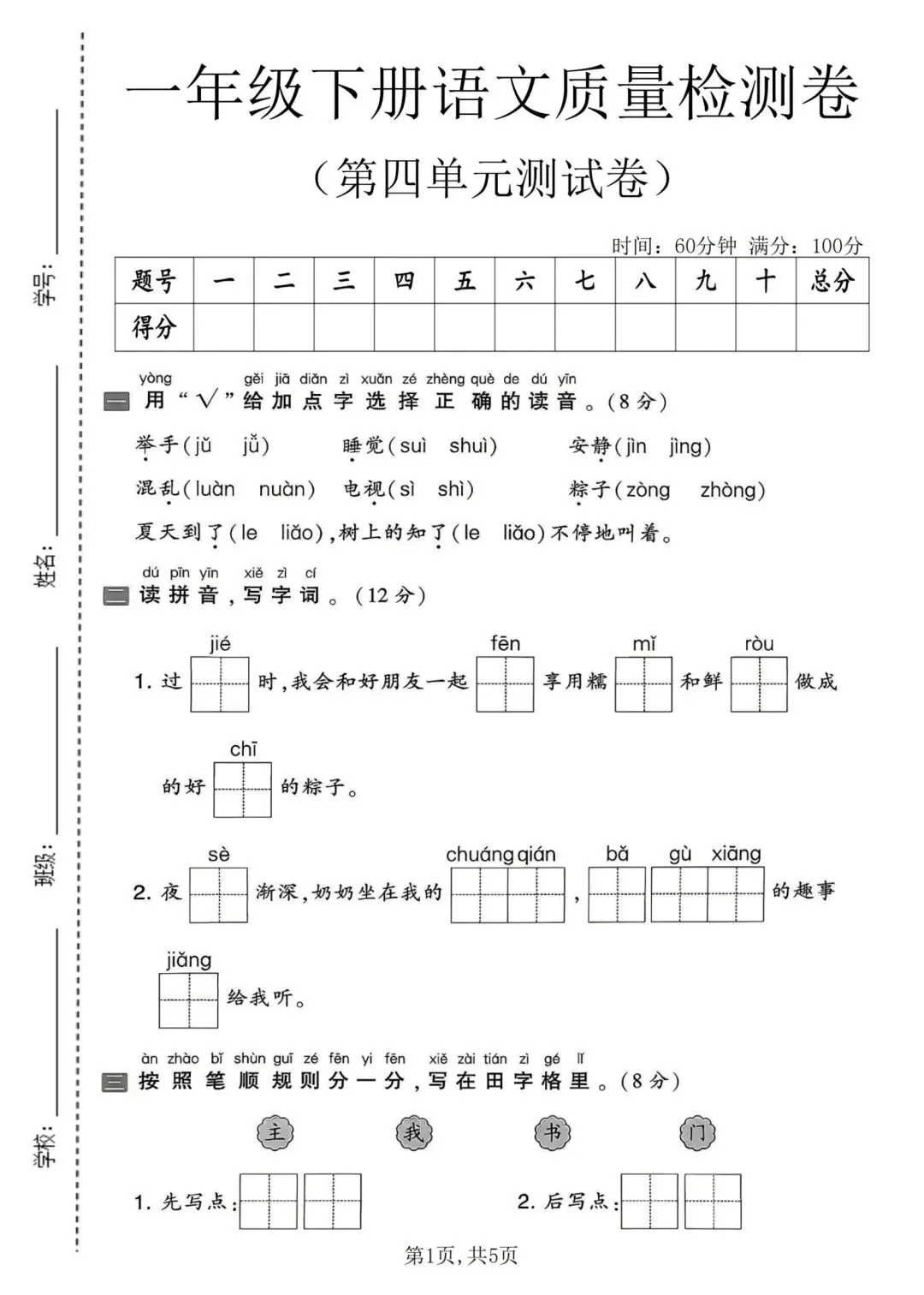 一年级下册人教版语文第四单元测试卷含答案可打印
