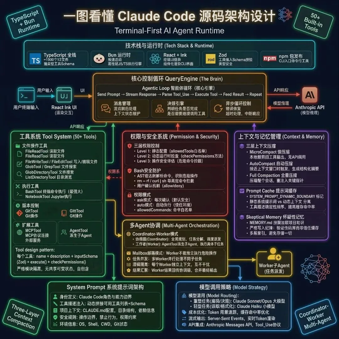 Claude Code 的源码不仅仅是代码的集合,它反映了一套成熟的 AI 编程工程哲学。它通过 Bun+React Ink 重塑了 CLI 交互,通过 AST 解析与多级权限 解决了安全顾虑,最重要的是,它通过多级压缩与怀疑性记忆 攻克了 Agent 长时间运行的核心痛点。