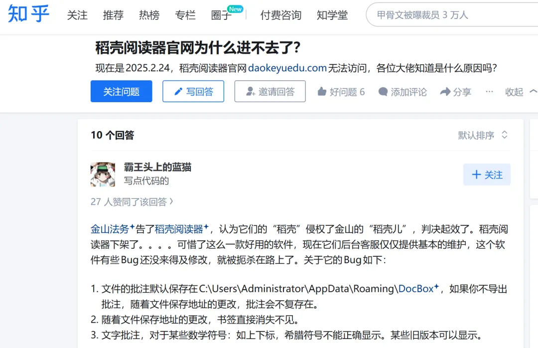 据多个消息来源确认,2024年,金山公司(旗下有“稻壳儿”品牌)的法务部门起诉了稻壳阅读器,指控其“稻壳”商标侵权,并且诉讼已经生效,导致软件被迫下架。受此影响,其开发商北京知客在线科技有限公司已停止软件的主动更新,后台客服仅提供基本的维护服务,一些已知的软件缺陷(Bug)也因此无法得到修复。