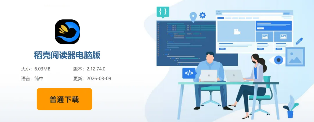 果然,稻壳还有更新。官方网站虽早已无法访问,但眼下仍有许多第三方软件下载站(如腾讯软件中心、3DM、金山毒霸软件管家等),提供稻壳阅读器的历史版本和最新的v2.12.74版的下载。