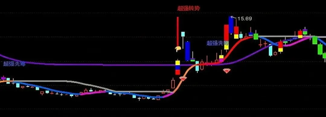 DRAWTEXT(YIX118 AND YIX22>7 AND CROSS(YIX21,YIX116),CLOSE*1.36,’超强转势’),COLORRED;