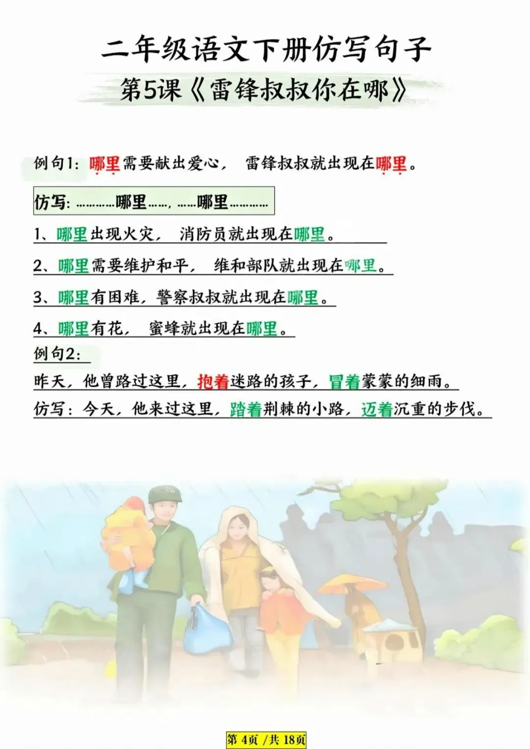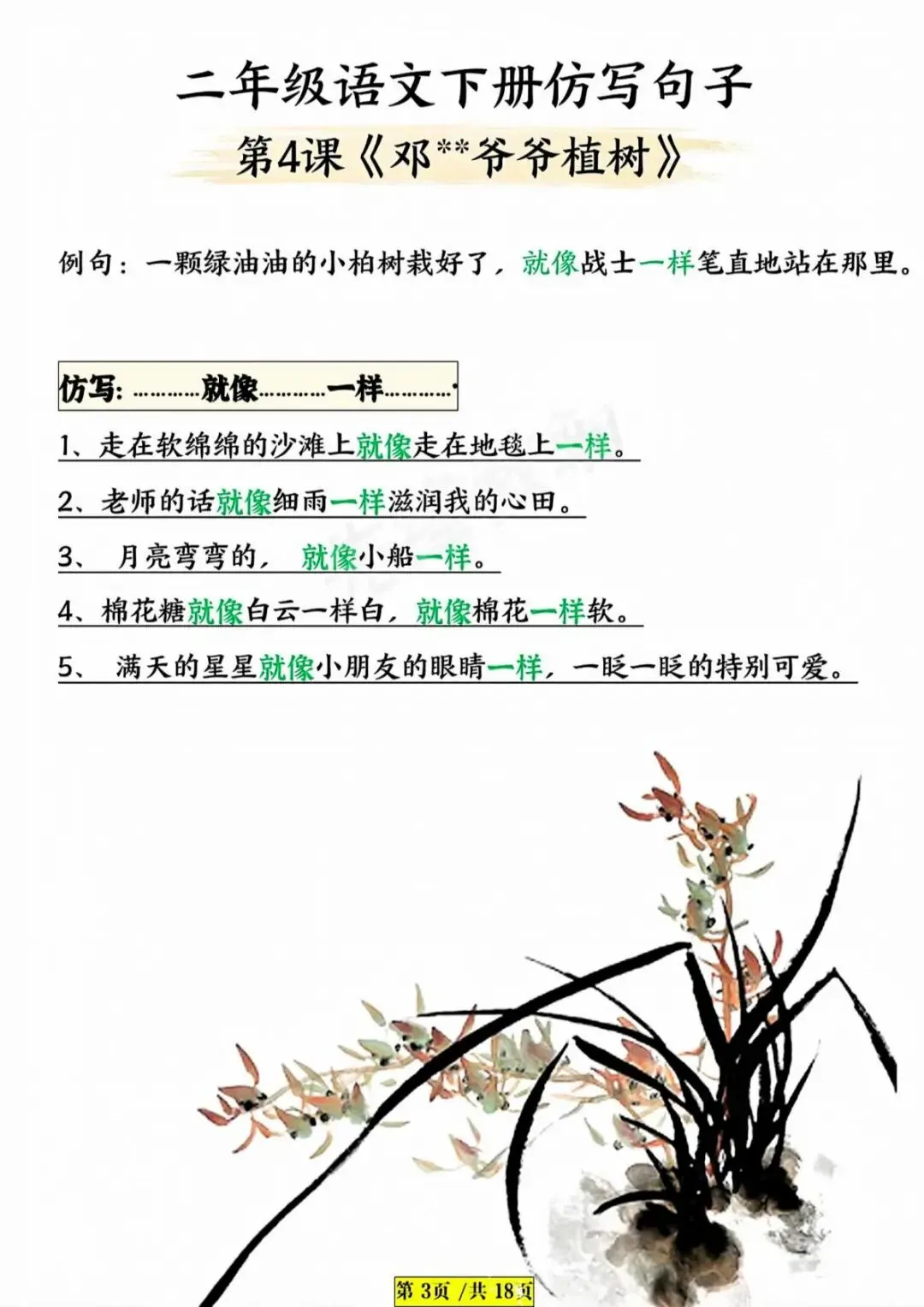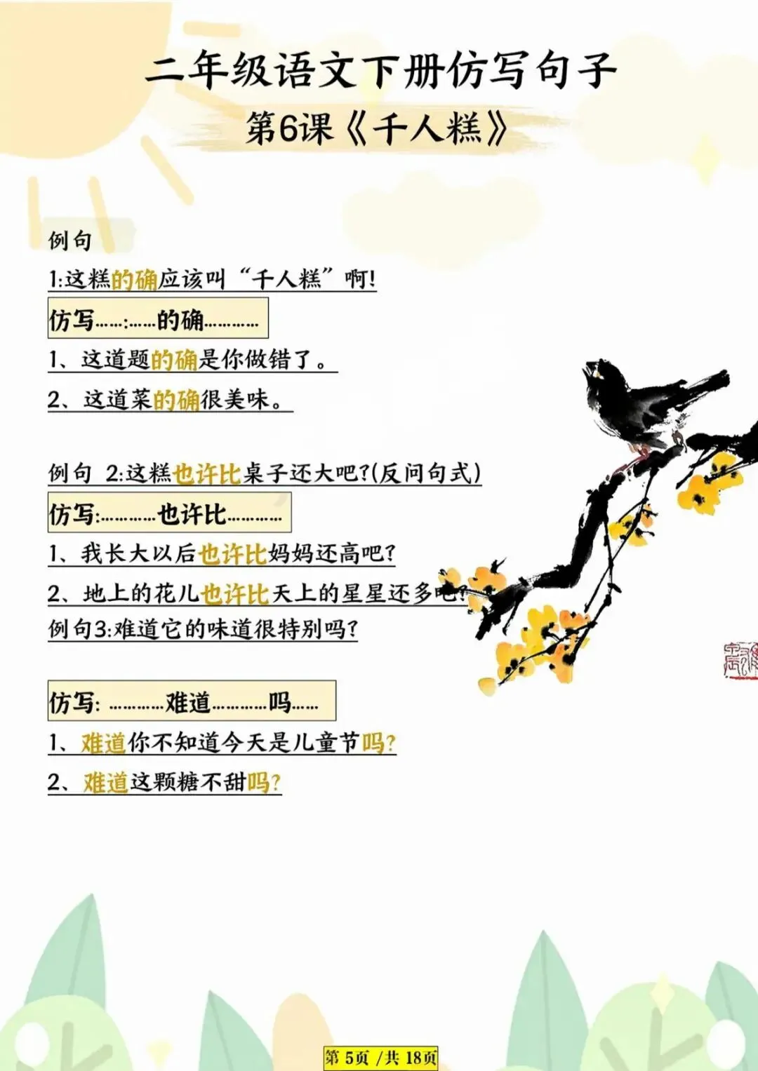 今天给大家分享的是:二年级(下)语文仿写句子,共15页,电子版可下载打印。文章末尾可直接领取全套电子版,无套路,欢迎收藏和下载。如果觉得这份资料不错,建议分享到班级群/年级群,让其他家长打印出来,帮助孩子学习;如果觉得合适,请支持正版!