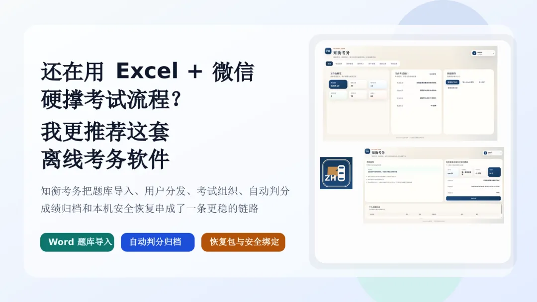 麻烦的是:题库在 Word,名单在 Excel,通知靠微信群,考完再人工统计成绩。人少的时候还能撑,一到批量考试、集中考试,或者现场网络不稳,流程很快就会乱起来。