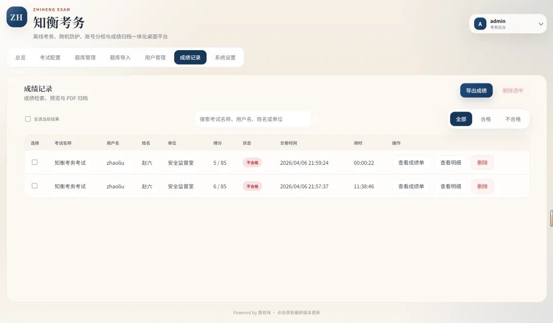 成绩这一块,我更看重考完以后是不是省事。交卷后能直接查结果、看明细、预览成绩单、导出归档,这比只给一个分数实在得多。