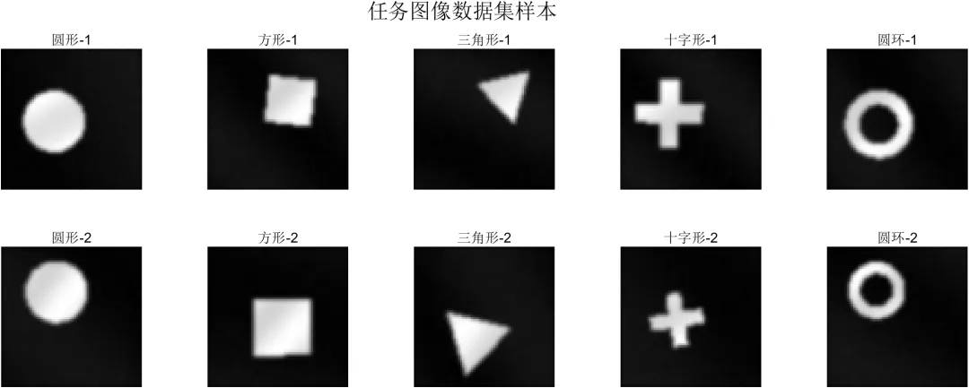 本文研究对象为任务图像传输系统。为了保证任务定义清晰、实验链路可控且结果便于解释,系统采用五类典型几何图形作为任务对象,包括圆形、方形、三角形、十字形和圆环。每幅图像在生成过程中具有一定的尺度变化、位置变化、角度变化以及轻度模糊与背景扰动,使得样本既保持明确类别边界,又不至于过于理想化。对该数据而言,任务目标不仅是重建视觉外观,更重要的是正确识别图形类别,并尽可能保持其几何结构与拓扑属性。