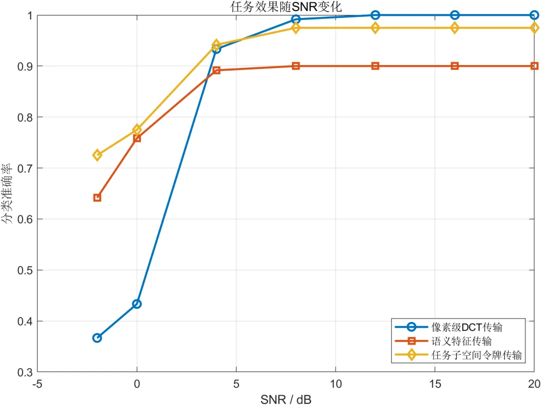 从整体结果看,三类方案在不同信噪比区间表现出明显不同的优势结构。首先,在低信噪比区域,像素级DCT传输的分类准确率明显偏低,说明在强噪声干扰下,大量像素域信息虽然仍被传输,但其中有效判别成分被噪声与量化失真严重破坏,导致接收端难以稳定完成分类任务。相比之下,语义特征传输与任务子空间令牌传输在低信噪比下表现更稳健,说明当发送内容已经围绕任务需求进行筛选时,系统对噪声的敏感性能够得到一定缓解。